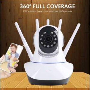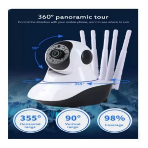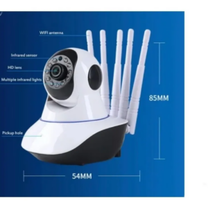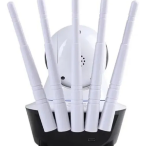 Cámara de vigilancia IP con 5 antenas, nuevo sistema de alcance, alta definición de imágenes, videos y audios. Visión nocturna, almacenamiento de tarjeta memoria (no incluida), soportes mobiles compatible Android/iOS alta gamma (iPhone 11 en adelante). Rotación 355•, ángulo de